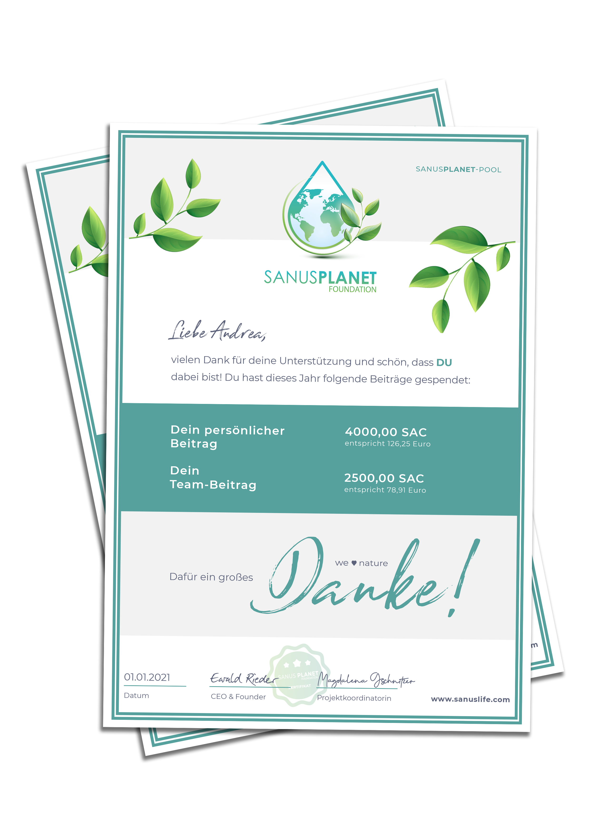 Bei jeder SANUSCOIN-Transaktion fließt automatisch ein Teil in den SANUSPLANET-Pool. Diese Erlöse werden an handverlesene Organisationen gespendet, die sich für den Schutz der Tiere und der Pflanzen sowie für Menschen in Not einsetzen. Mit dem Company Package ebnest du dir den Weg, ein soziales und ökologisch verantwortliches Unternehmen zu werden!
